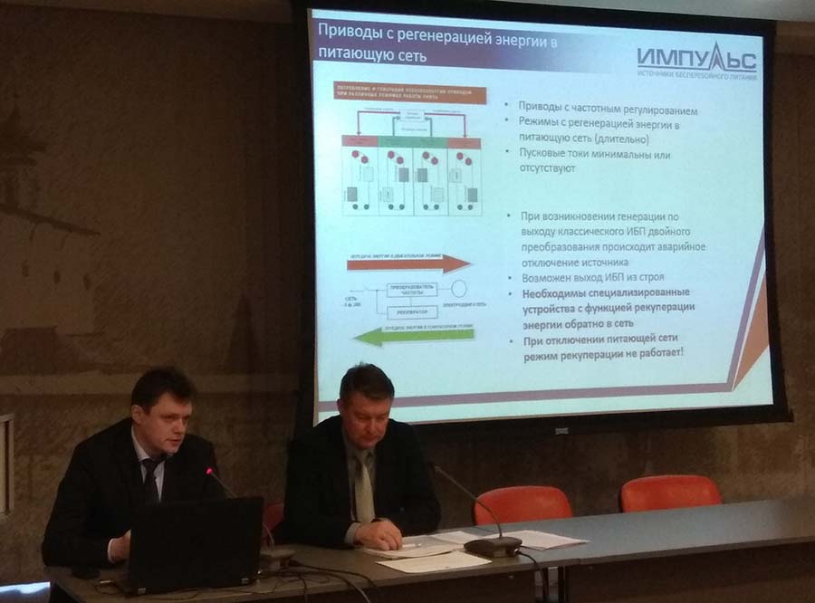 Помимо этого, в ходе конференции представитель компании рассказал об особенностях построения системы электроснабжения лифтового оборудования; необходимости обеспечения бесперебойного электропитания в лифтах и особенностях самих ИБП. А также презентовал новую разработку компании – блок контролируемой нагрузки ИМПУЛЬС-БКН для бесперебойной работы современных лифтов.